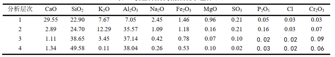 Table 1 shows the X-ray fluorescence spectrometry analysis of the castable lining samples. The data in Table 1 show that layers 1 and 2 contain large amounts of K and Na salts, while the original Al and Si content in the castable is significantly lower than normal, indicating severe corrosion by alkaline substances. The CaO content in layer 1 is significantly higher than normal, likely originating from cement clinker. This is possibly due to the surface of the burner lining castable being exposed to high temperatures by K and Na, resulting in the formation of a liquid phase and the adhesion of cement clinker fly ash to the surface. From layer 1 to layer 3, the Na content decreases significantly, while K remains present in considerable quantities in layer 3, possibly because K has a stronger penetrating power than Na. In layer 2, the K content is much higher than the Na content, suggesting that K salts are the primary agent causing chemical erosion and damage to the internal matrix of the castable.