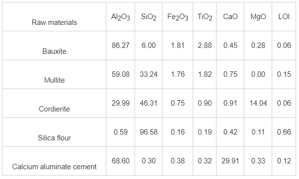 1.Raw Materials and Procedure The main raw materials for this experiment are mullite, bauxite, cordierite, silica fume, and calcium aluminate cement. The main chemical compositions of the raw materials are shown in Table 1.
