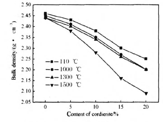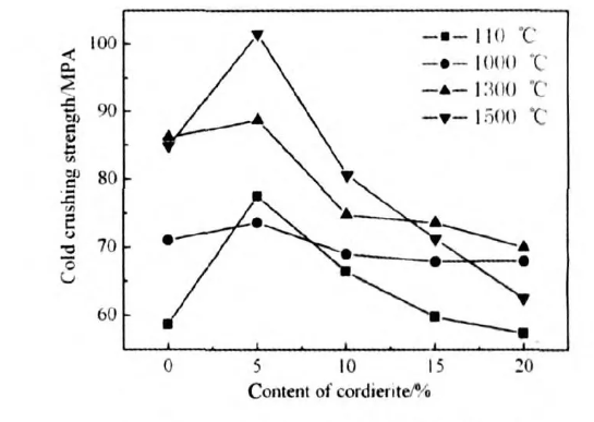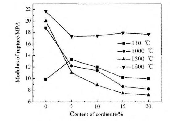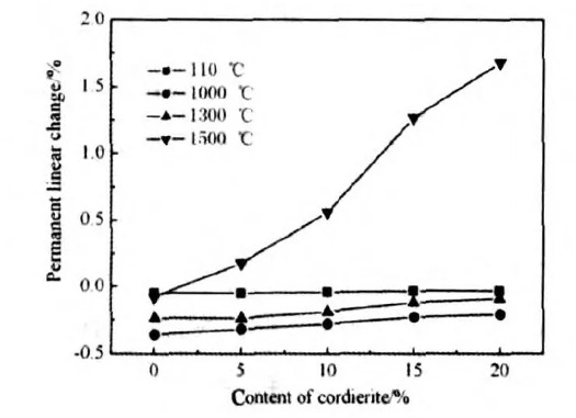 After heat treatment at 1500℃, the sample gradually changed from shrinkage to expansion as the cordierite content increased, and the expansion rate gradually increased. This is because cordierite melts and decomposes into mullite and magnesia glass at 1435℃, simultaneously expanding. Therefore, after heat treatment at 1500℃, as the cordierite content increases, the sample gradually changes from shrinkage to expansion, and the expansion rate gradually increases. In practical applications, products containing cordierite are typically used at temperatures not exceeding 1400℃. This is because cordierite decomposes above this temperature, causing many of the excellent properties of cordierite-containing materials, such as thermal shock resistance and low coefficient of expansion, to disappear.