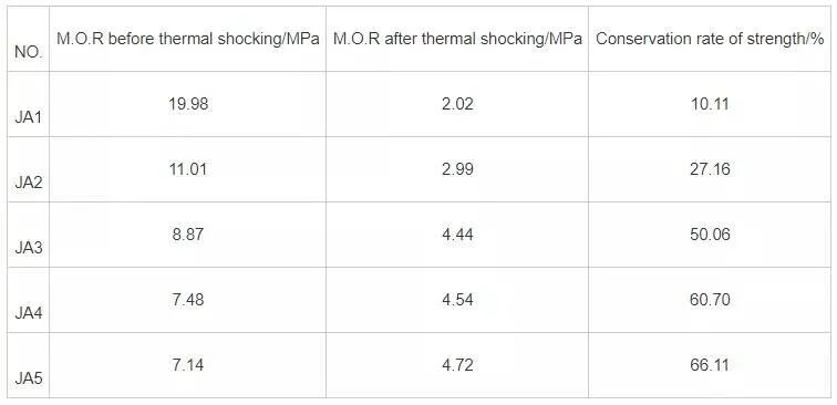 With the increase of cordierite content, the coefficient of thermal expansion of the sample increased slightly. Theoretically, the introduction of cordierite should reduce the coefficient of thermal expansion of the material. However, as mentioned earlier, the chemical composition of the cordierite used in this experiment differs somewhat from the theoretical value, resulting in an excess of silica. This leads to a series of quartz crystal transformations during heating, causing volume expansion (see Table 3), thus correspondingly increasing the coefficient of thermal expansion of the material. It can also be seen that the coefficients of thermal expansion of samples JA3 and JA5 with cordierite additions of w(cordierite) = 10% and w(cordierite) = 20% are not significantly different.